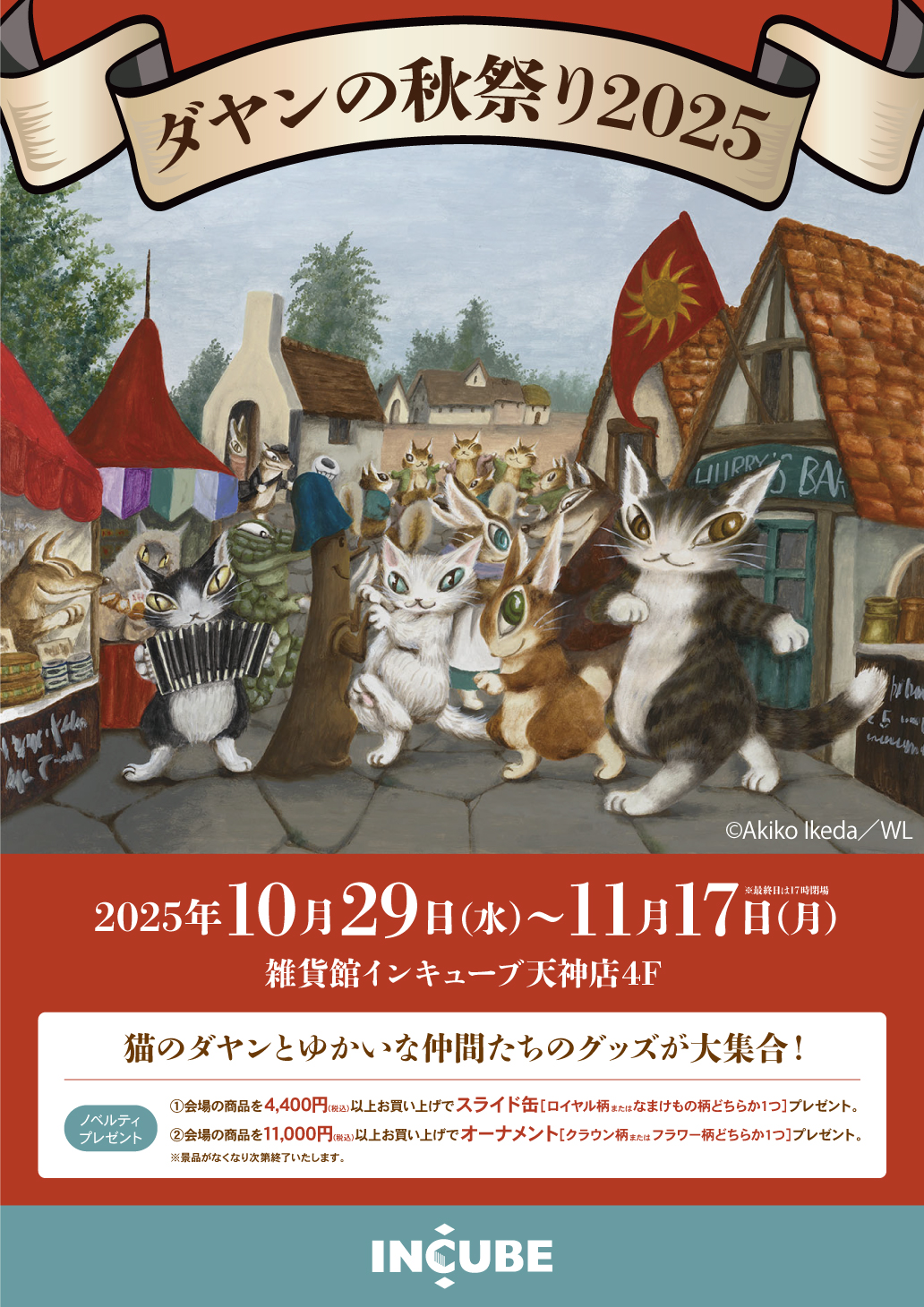 2025年10月29日(水)~2025年11月17日(月)の期間、「ダヤンの秋祭り2025」を雑貨館インキューブ天神店4階にて開催いたします。