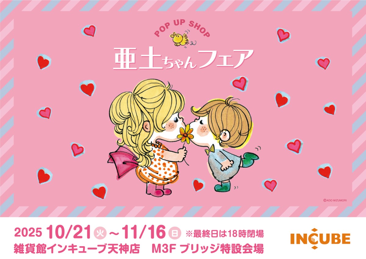 イラストレーター、画家、女優、ジャズ歌手などマルチに活躍し、“カワイイ文化”の先駆者でもあるアーティスト、水森亜土のポップアップストア「亜土ちゃんフェア」を、2025年10月21日(火)より雑貨館インキューブ天神店 M3Fブリッジ特設会場にて期間限定で開催いたします。