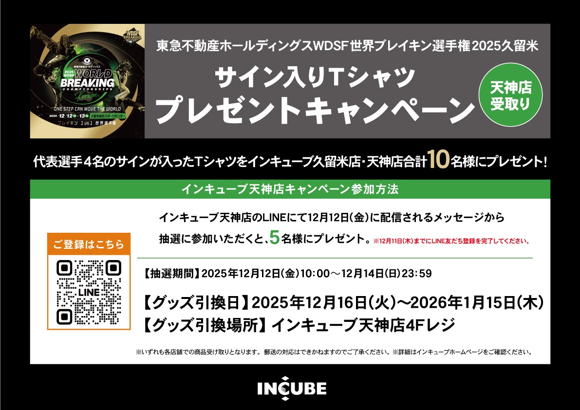 インキューブ天神店のLINEにて12月12日(金)に配信されるメッセージから抽選に参加いただくと、5名様にプレゼント。