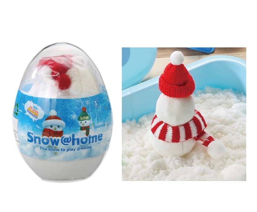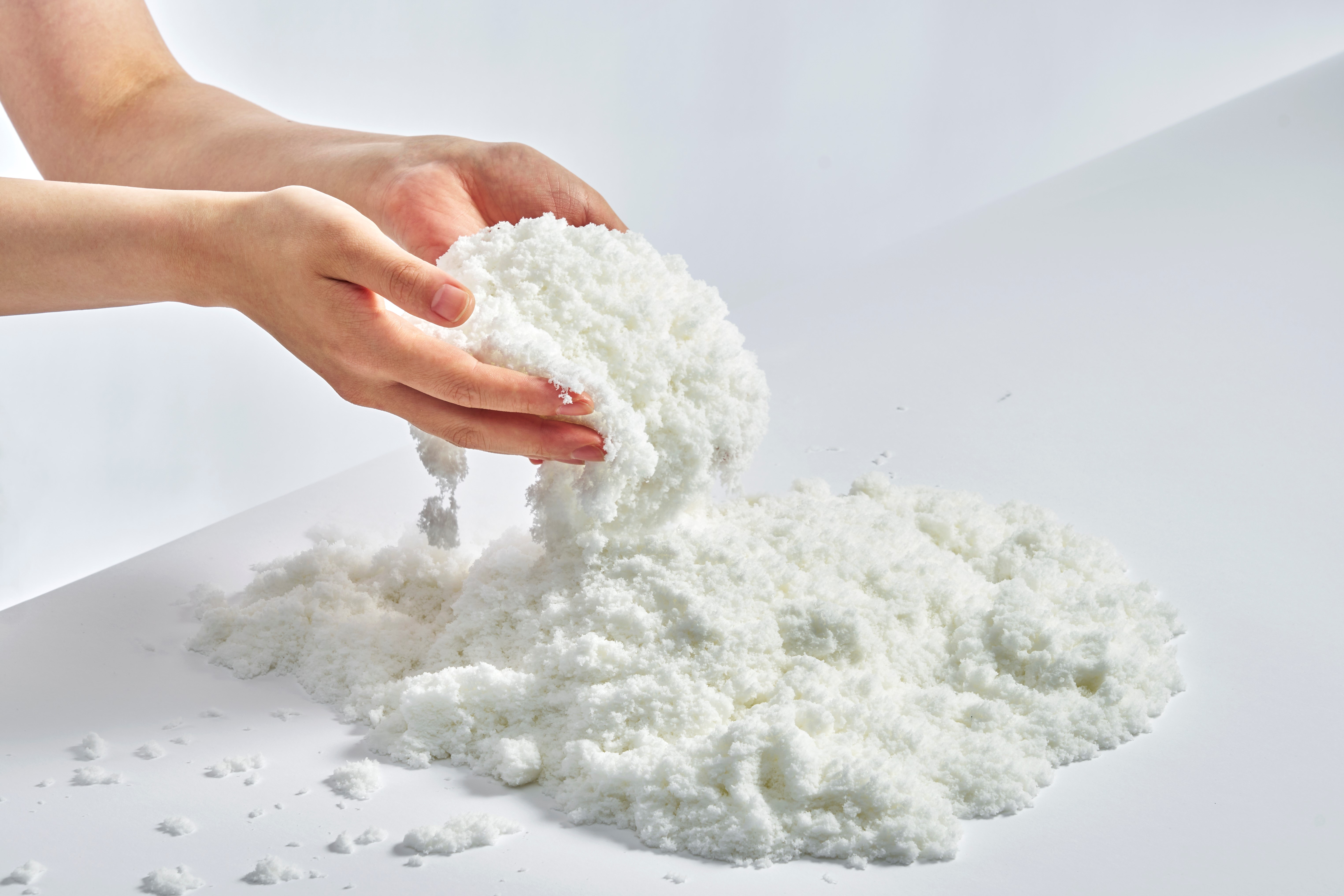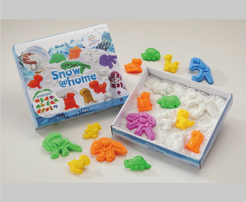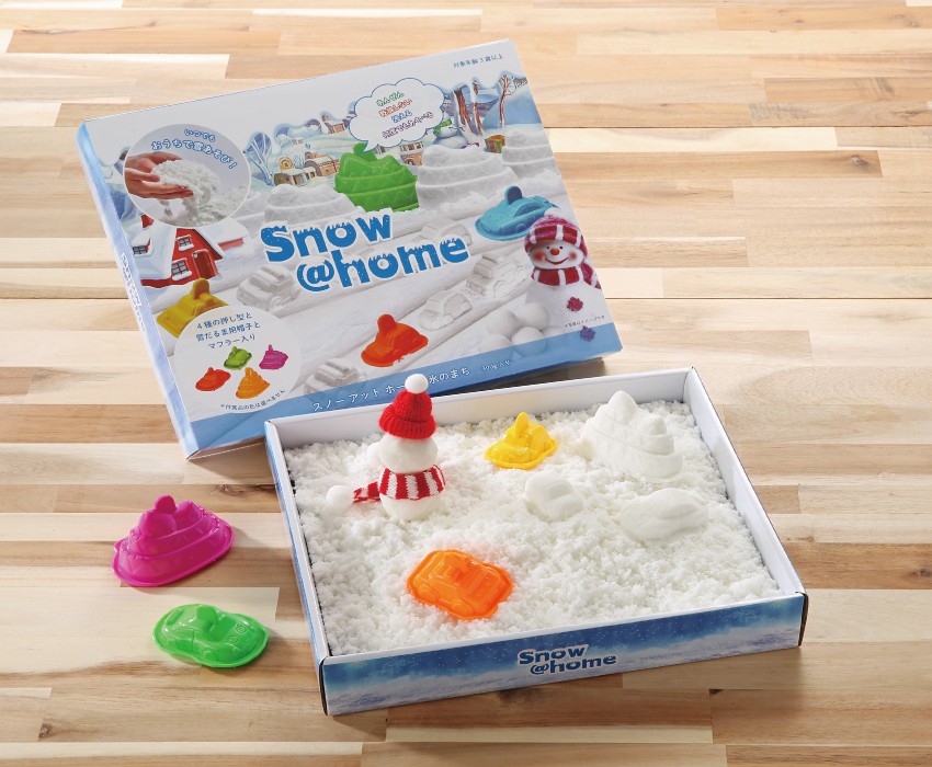 スノーアットホームは不思議な手触りで大人も子供もワクワクします。ギュッと握るとかたまり、 指先でほぐすとふわふわとこぼれます。丸めたり、 押し型をつかったり、 遊び方は自由です。繰り返し使えて、汚れたら水で洗って乾かすと元通りになります。