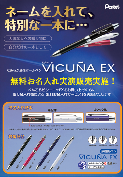 ぺんてる「ビクーニャEX」をお買い上げの方に彫名入れ機による「無料お名入れサービス」を実施いたします!大切な方への贈り物として、自分だけの1本としていかがでしょうか。