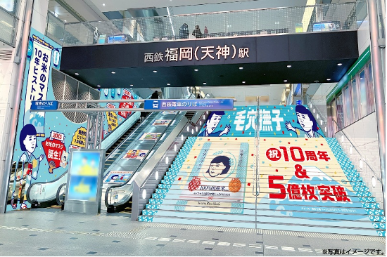 “九州で最も賑やかな街”として知られる天神の入口、西鉄 福岡(天神)駅の北口階段と壁面をジャック!