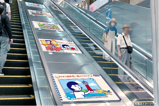 階段には、巨大な「お米のマスク」が登場!壁面には、お米のマスクの10周年ヒストリーも。エスカレーターのスロープでは、撫子ちゃんの楽しい福岡旅の様子も公開中♪