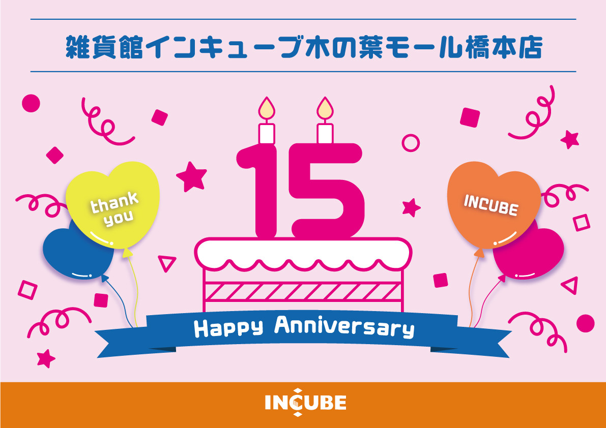 雑貨館インキューブが木の葉モール橋本に出店してはや15年。地域の皆様に見守られながら、15年を迎えることになりました。木の葉モール橋本店では、これまでの感謝を込めて、様々なイベントやノベルティをご用意し、皆様のご来店をお待ちしております。