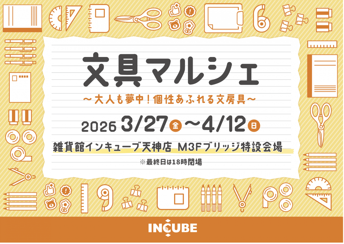 雑貨館インキューブ天神店では、文具イベント「文具マルシェ」を開催いたします。いま話題の文具が勢ぞろい。ふだん店頭では出逢えない、イベントだけの商品も会場に並びます。ぜひ会場でお気に入りの文具を見つけてください。