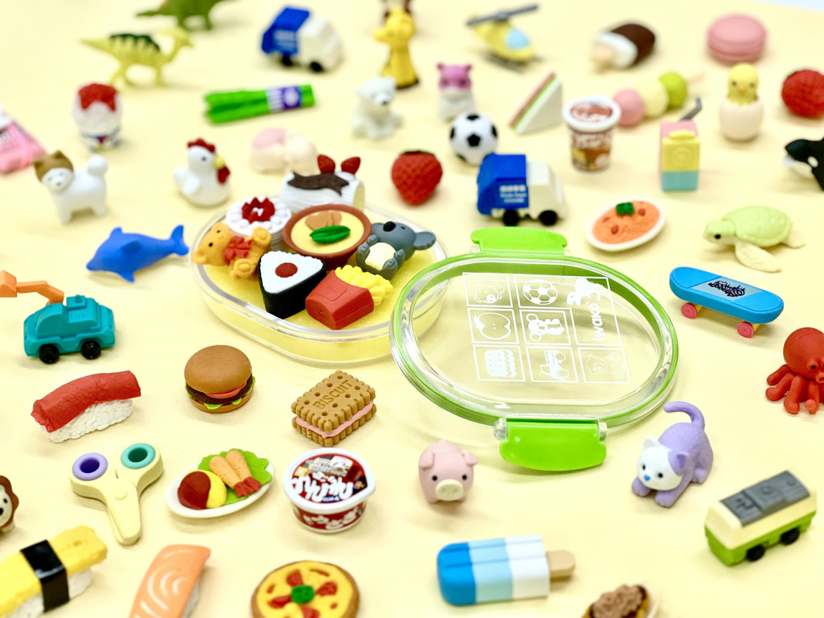 お寿司やスイーツ、動物など身近なモチーフの消しゴム"おもしろ消しゴム”。詰め放題では約50種類のおもしろ消しゴムが並び、お好きな消しゴムをお選びいただけます。