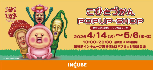 雑貨館インキューブ天神店では、2026年4月14日(火)~2026年5月6日(水・休)まで M3Fブリッジ特設会場にて 「こびとづかんPOPUP-SHOP こびと百貨店 in 雑貨館インキューブ天神店」を開催 いたします。「こびとづかん」のPOPUPーSHOP限定グッズやおすすめアイテムが勢揃いします。